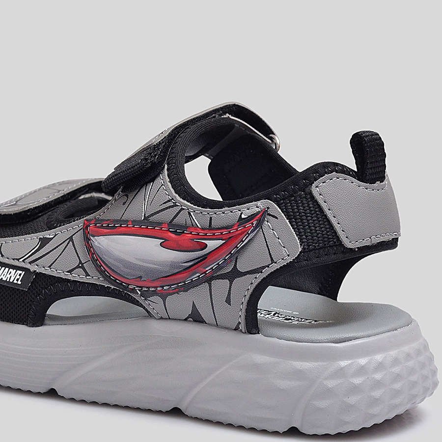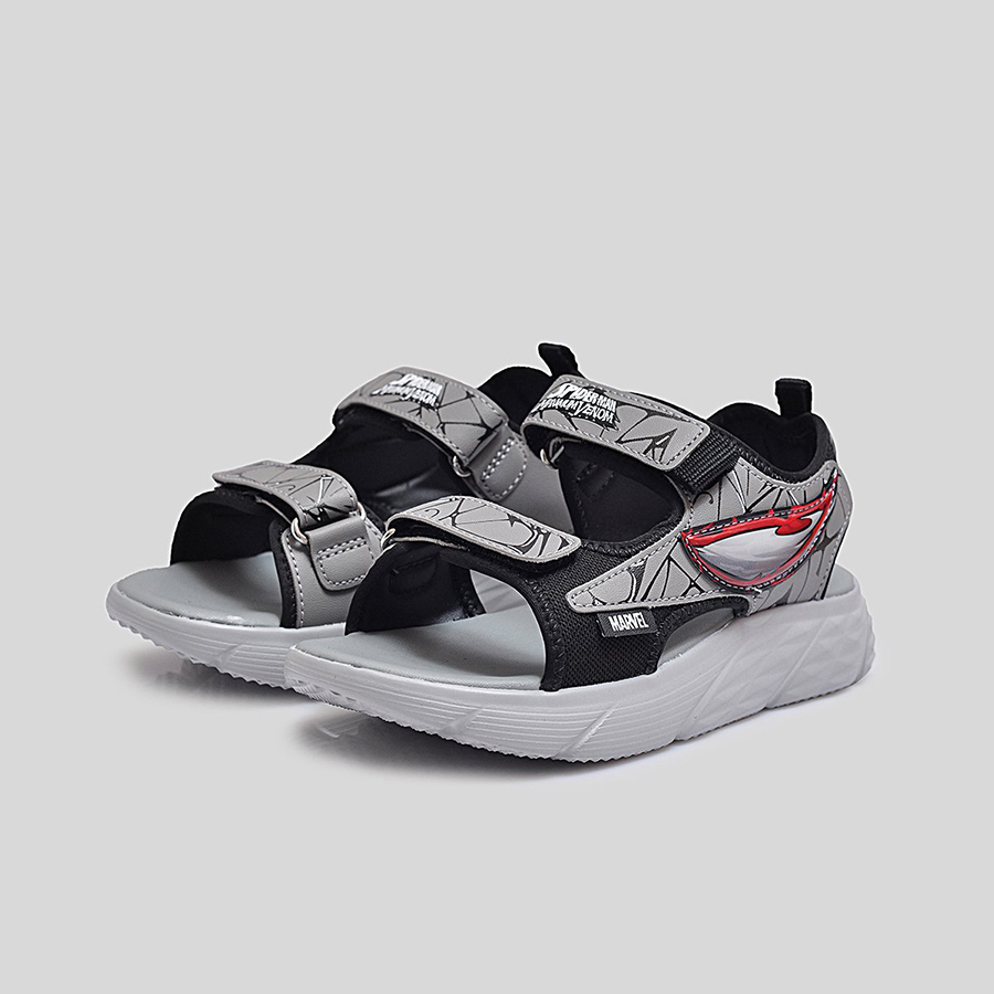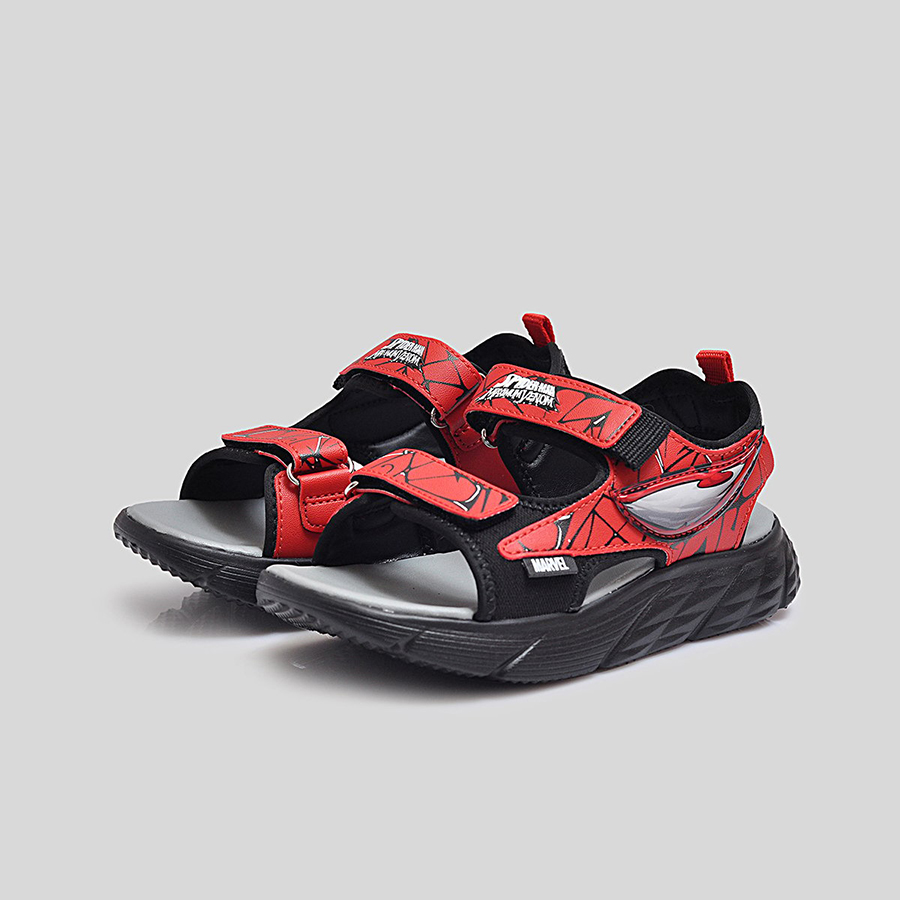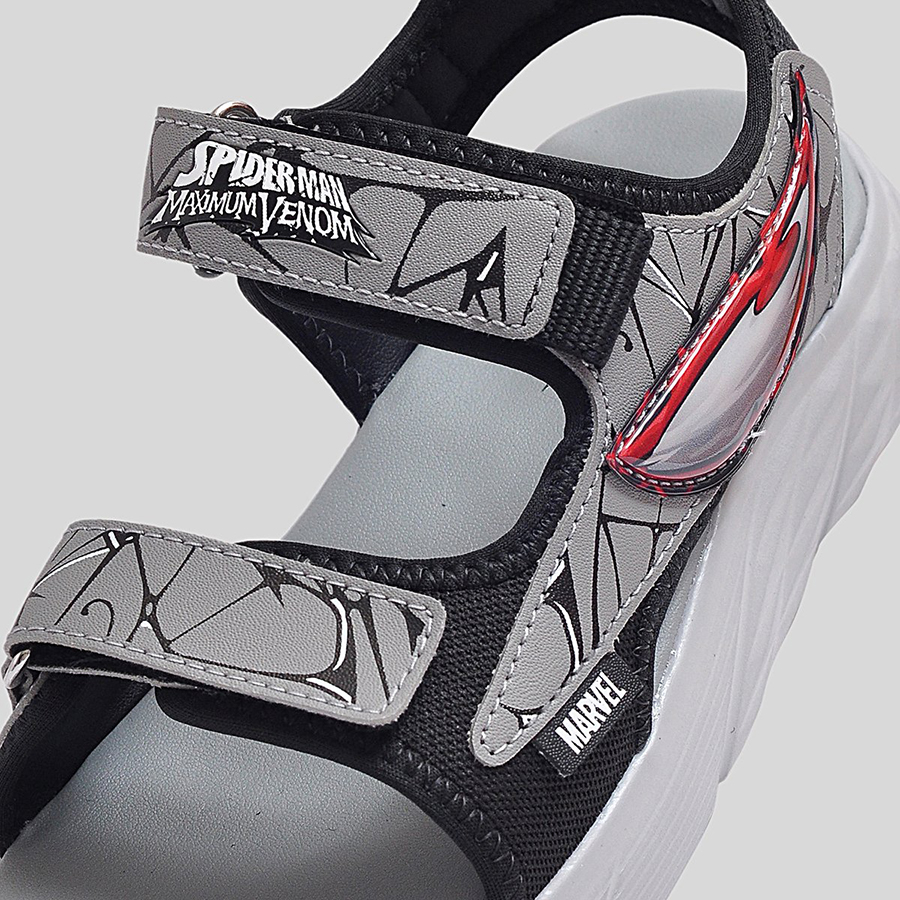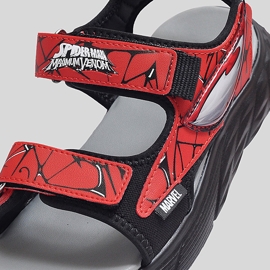 Phần quai sandal được làm từ chất liệu tổng hợp cao cấp, có độ bền cao và in họa tiết Spider-Man nổi bật, giúp bé thêm tự tin trong từng bước đi. Quai dán tiện lợi cho phép bé dễ dàng mang vào và tháo ra, đồng thời điều chỉnh vừa vặn theo kích thước bàn chân. Đế sandal được thiết kế dày dặn, êm ái, với các rãnh chống trượt giúp tăng khả năng bám dính và giảm trơn trượt khi di chuyển.